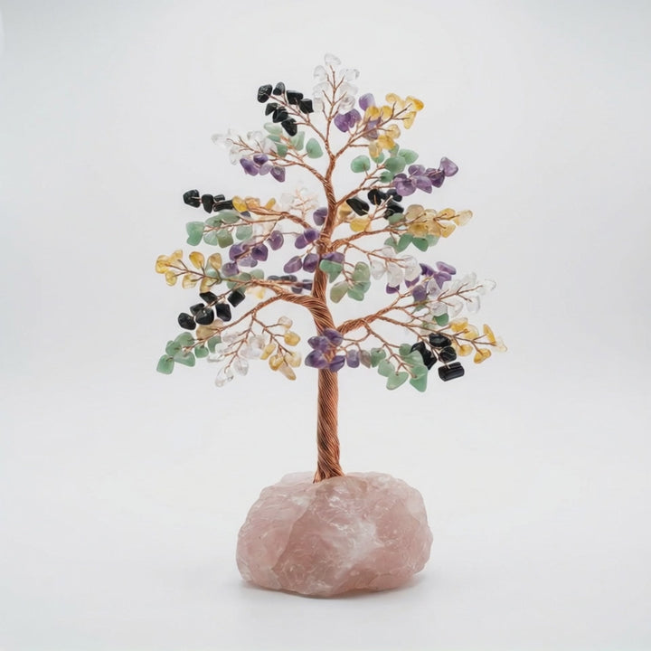 Each tree features a carefully curated collection of natural crystals, hand-selected for their unique properties: